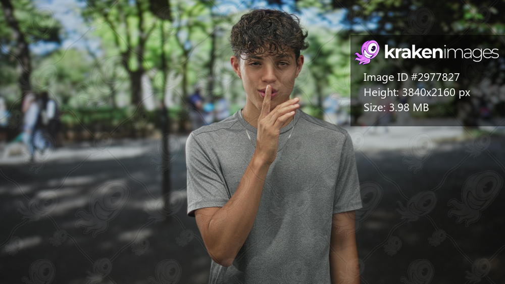 Teenage boy with finger to lips for silence in park, wearing gray shirt and necklace, facing camera with slight smile; contemplation.