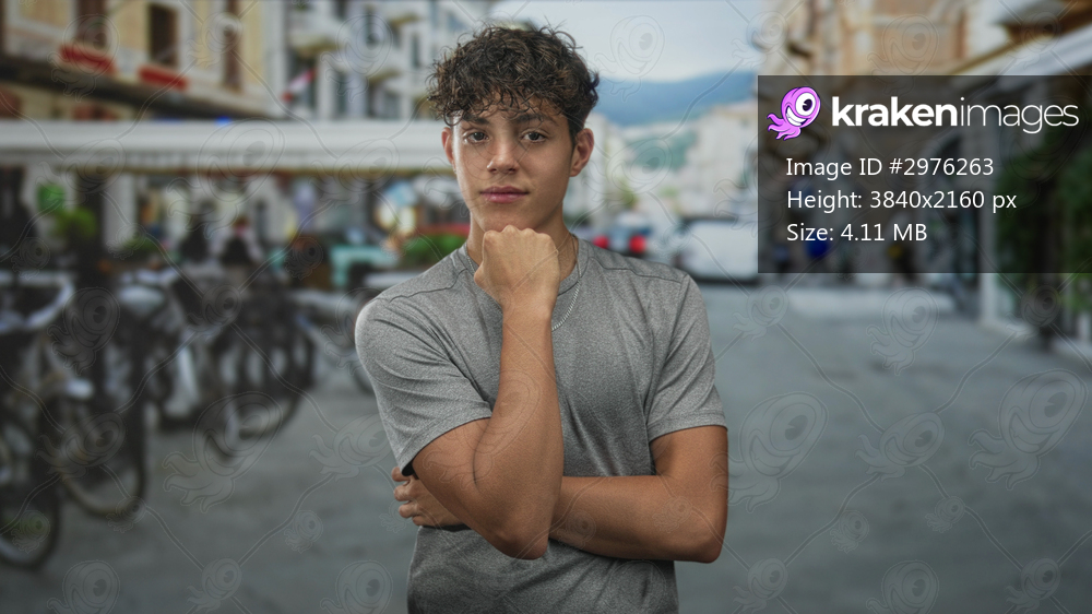 Teenage boy with fist under chin and arm crossed, posing on a street with parked bicycles and buildings in view; thoughtful introspection youth.