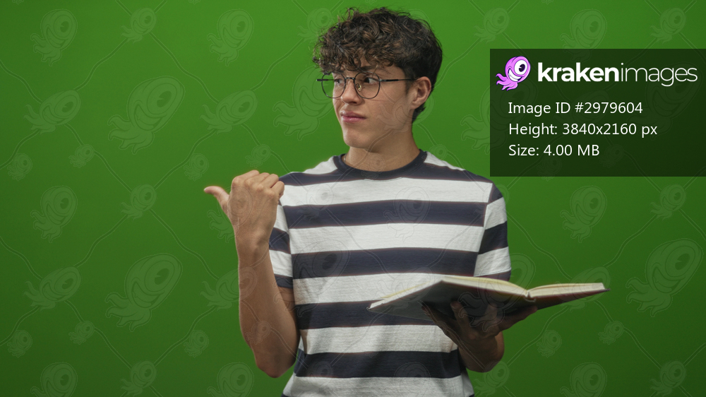 Teenage boy with glasses in striped shirt pointing thumb while holding an open book and reading pages in studio; curiosity learning.