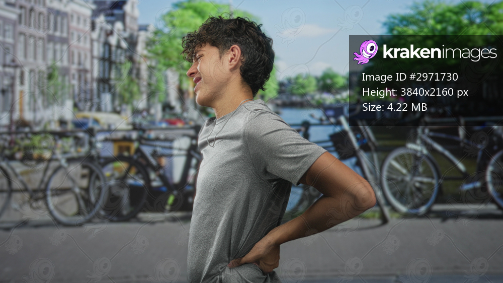 Teenage boy hand on lower back showing backache beside parked bicycles on canal street; discomfort brief pause.