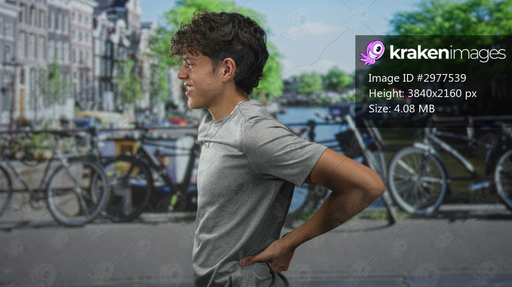 Teenage boy hand on lower back showing backache beside parked bicycles on canal street; discomfort brief pause.
