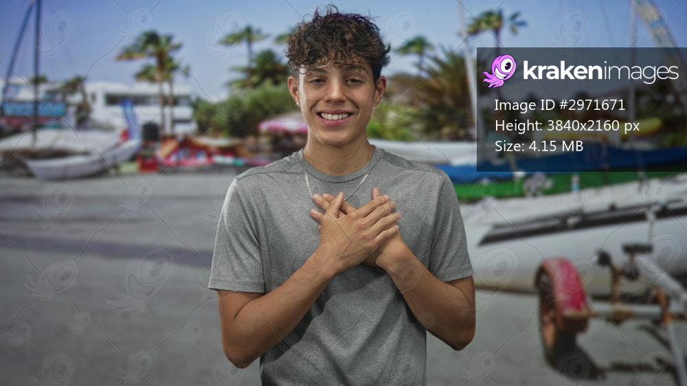 Teenage boy with hands crossed over chest smiling on street by marina boats and trailer; gratitude reflection.