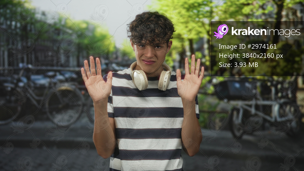 Teenage boy with headphones holds palms up in a stop gesture on a street with bicycles and canal visible; disgust refusal.