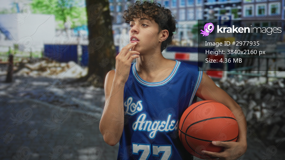 Teenage boy holding a basketball with finger to chin gesture, wearing a los angeles jersey, standing by a tree, parking sign and construction barricade on a city street; contemplative youth focus. - Kraken Images