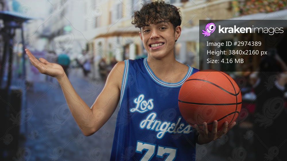 Teenage boy holding a basketball with palm up gesture on a street lined with cafes and shops; confidence.