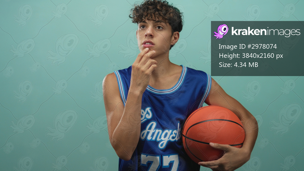 Teenage boy holding basketball, finger to lips for silence, wearing blue los angeles jersey in studio; thoughtful reflection quiet focus.
