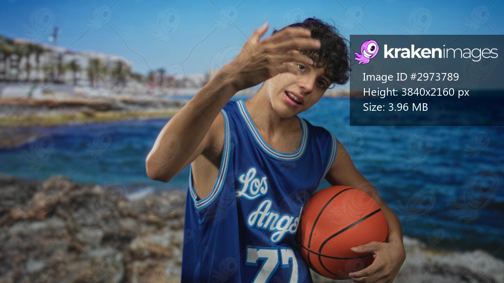 Teenage boy holding basketball points finger to camera on rocky beach wearing los angeles jersey; youthful confidence.