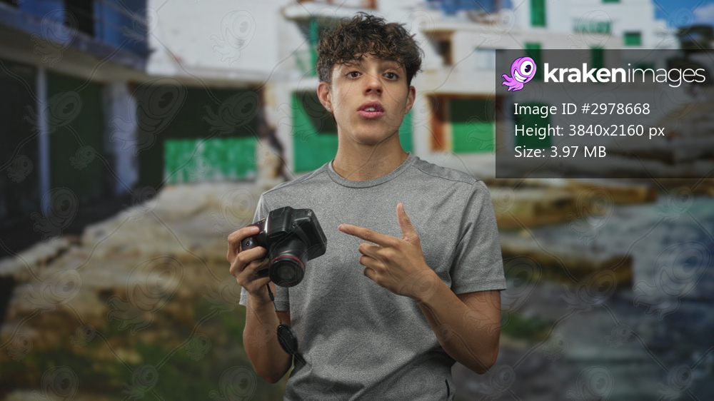 Teenage boy holding dslr camera, pointing finger and adjusting lens on a street; curiosity creativity.