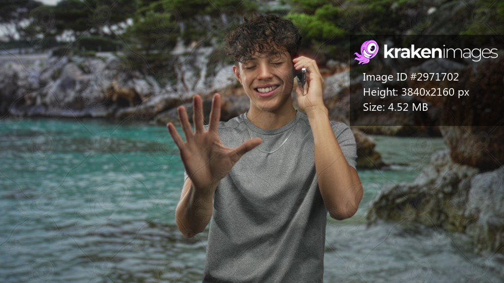Teenage boy holding smartphone to ear and smiling with eyes closed on rocky beach shoreline wearing gray t shirt and silver chain; relaxed summer vacation. - Kraken Images