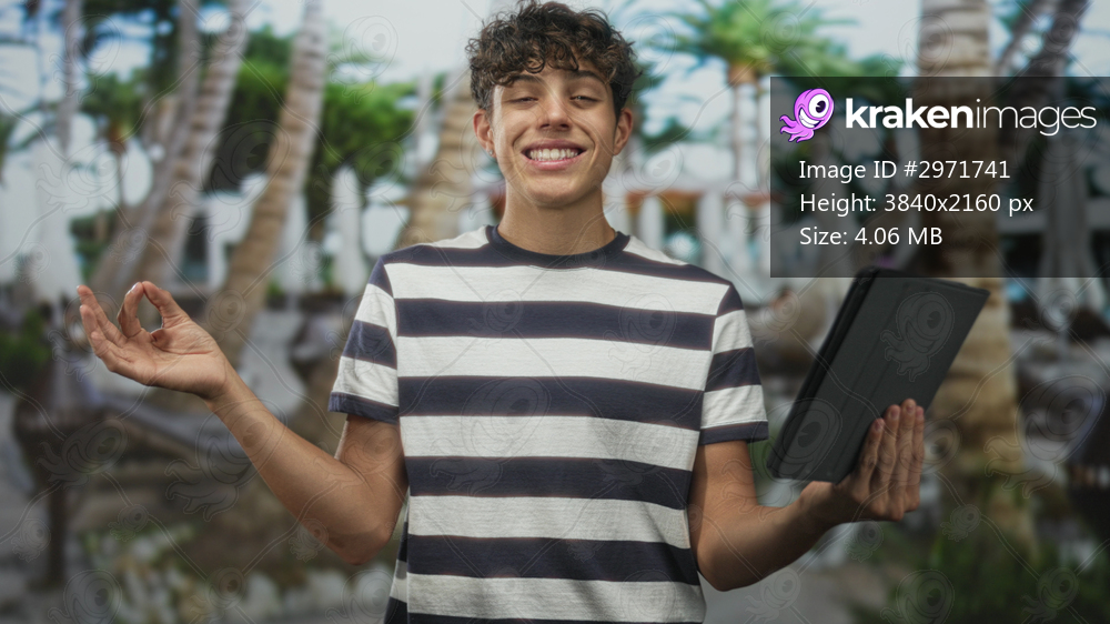 Teenage boy holding tablet and making ok sign beside palm trees and pool at resort building; relaxation mindfulness.