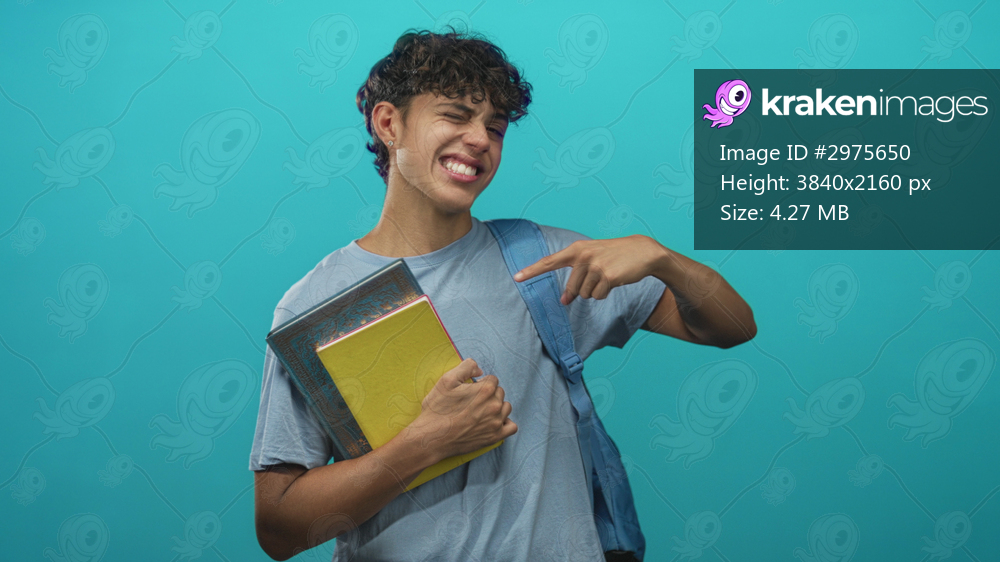 Teenage boy holding yellow notebook and textbook with backpack strap over shoulder, points finger to book while winking and smiling in studio; playful. - Kraken Images