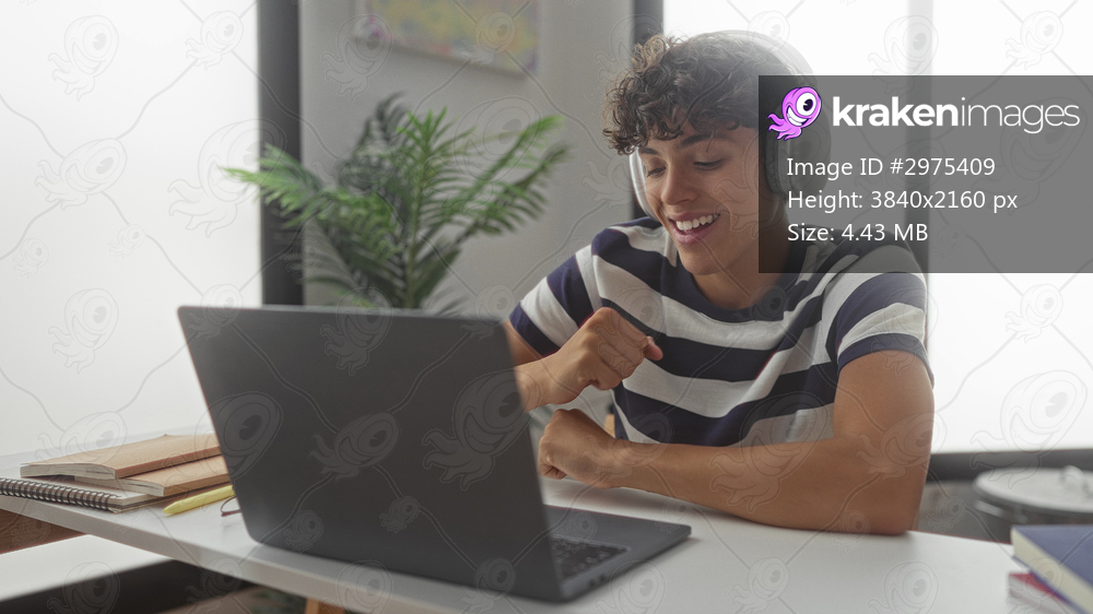 Teenage boy in a navy striped shirt wearing white headphones, smiling and tapping a laptop keyboard at a desk with notebooks and a plant in a studio; joyful study session. - Kraken Images