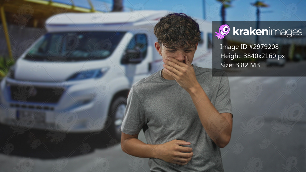 Teenage boy in gray t shirt clutching chest with hand over mouth on street beside parked white motorhome; panic illness emergency.