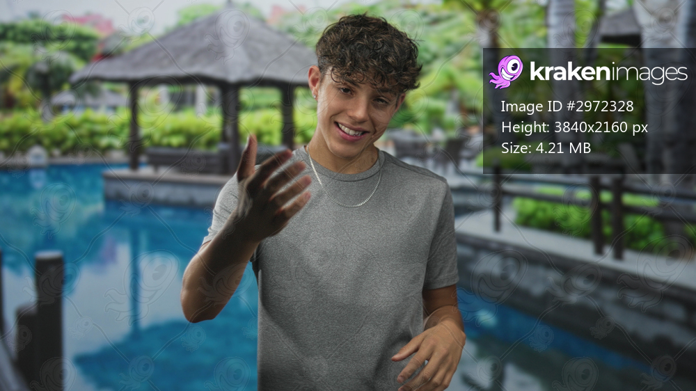Teenage boy in gray t shirt smiling and giving bare hand thumbs up by a resort pool near building with gazebo; playful confidence.