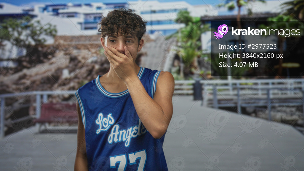 Teenage boy in los angeles basketball jersey covering his mouth with hand and smiling while standing on a building pier with railing and bench visible; surprise youth energy. - Kraken Images