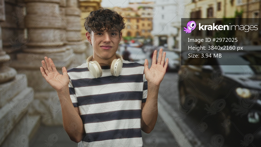 Teenage boy in striped shirt with headphones around his neck raises both palms in a shrug surrender gesture on a narrow european street beside stone building and parked cars; playful defiance. - Kraken Images