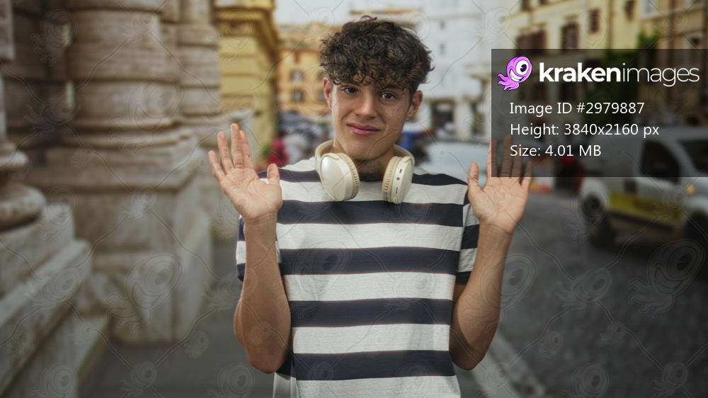 Teenage boy in striped shirt with headphones around his neck raises both palms in a shrug surrender gesture on a narrow european street beside stone building and parked cars; playful defiance. - Kraken Images