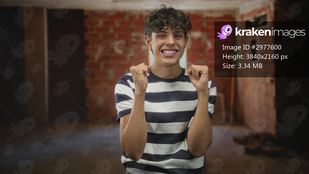 Teenage boy in striped shirt smiling with fists raised and bare forearms inside an unfinished brick building under renovation; joy achievement youth.