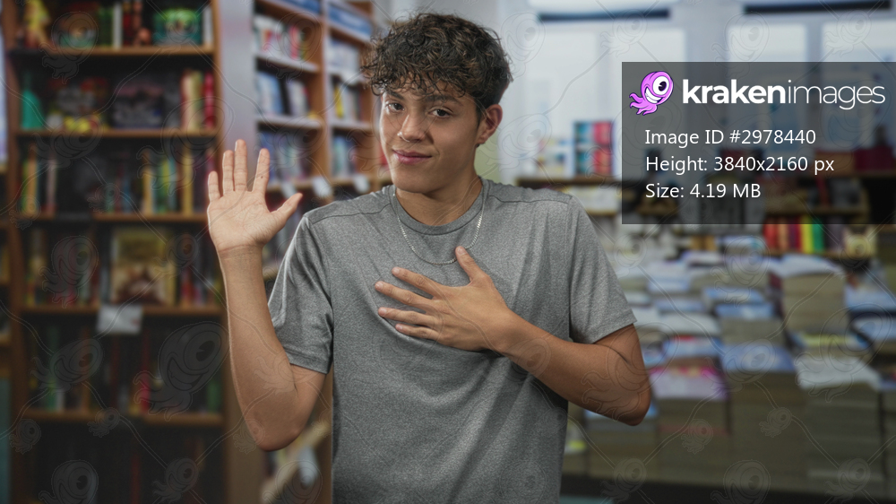 Teenage boy with palm raised and hand on chest wearing gray shirt and silver chain in a bookstore building; sincerity promise.