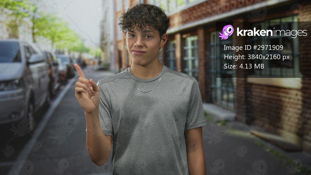 Teenage boy pointing finger upward at camera on a brick street with parked vans and sidewalk, wearing gray t shirt and chain necklace; confidence reminder. - Kraken Images