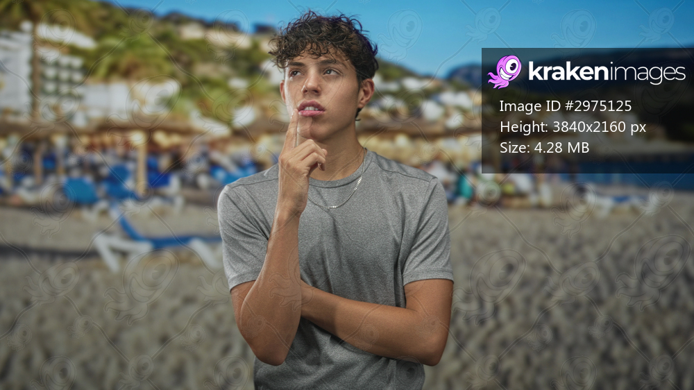 Teenage boy pointing finger upward with hand visible in front of beach building and sandy shore; confidence youthful energy.