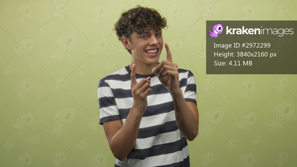 Teenage boy points finger at camera while smiling, bare forearms visible, wearing navy and white striped t shirt against green studio backdrop; playful confidence. - Kraken Images