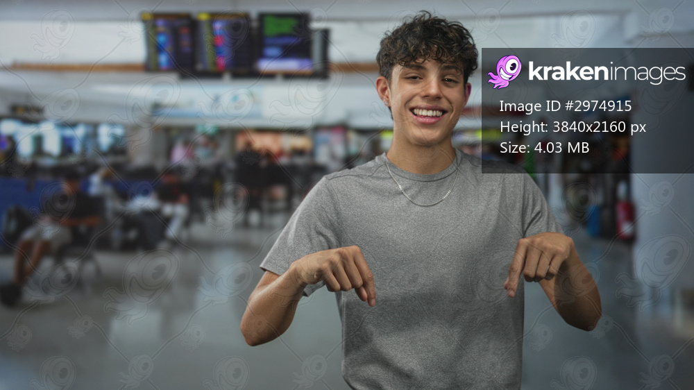 Teenage boy points finger down while smiling, gray tee and chain necklace visible in airport concourse; playful confidence.