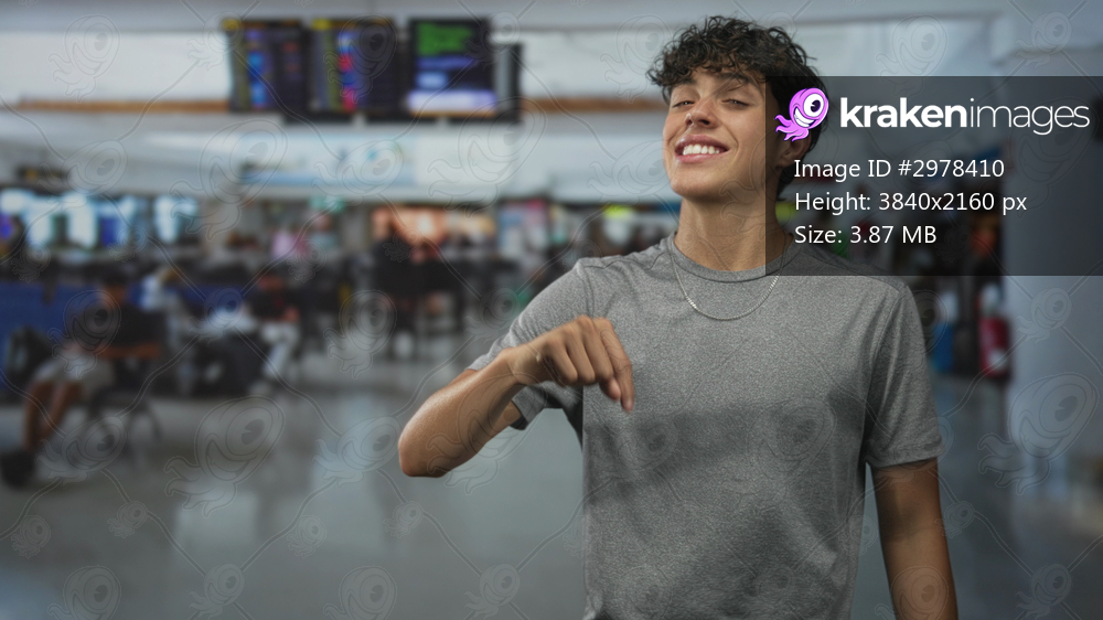 Teenage boy points finger down while smiling, gray tee and chain necklace visible in airport concourse; playful confidence.