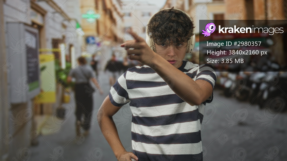 Teenage boy points finger forward wearing over ear headphones and a striped shirt in a crowded street market; curiosity discovery.