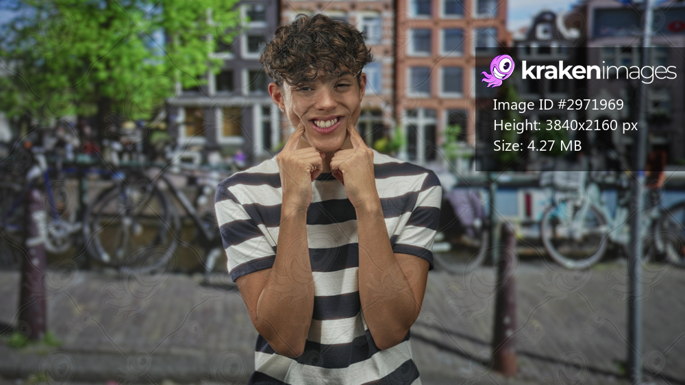 Teenage boy pressing index fingers to cheeks to force a smile on a cobbled street with bicycles and canal buildings; playfulness youth spontaneity.