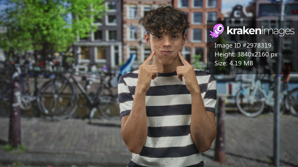 Teenage boy pressing index fingers to cheeks to force a smile on a cobbled street with bicycles and canal buildings; playfulness youth spontaneity.