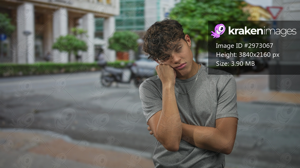 Teenage boy rests cheek on hand with arm crossed, visible hand and cheek gesture on street near scooter and building; boredom contemplation.