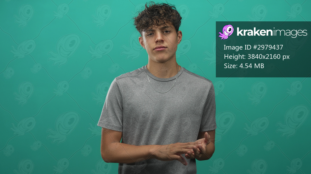 Teenage boy rubbing hands, wearing gray tee and silver chain, direct gaze in studio with teal backdrop; quiet contemplation.