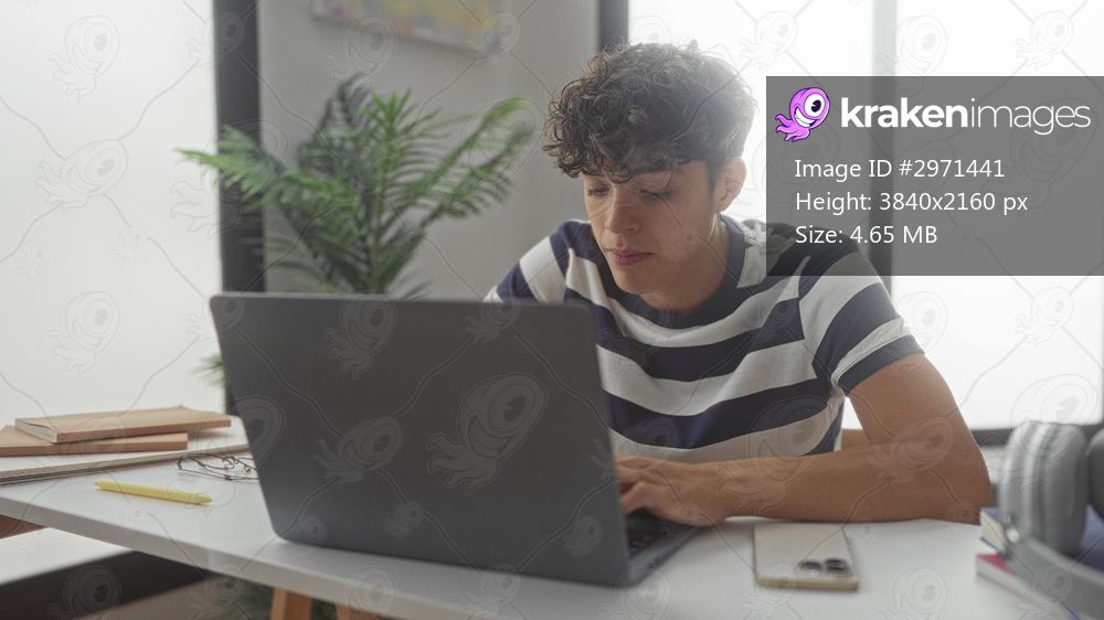 Teenage boy typing on laptop with hands on keyboard at a desk in a building, striped shirt visible; concentration study.
