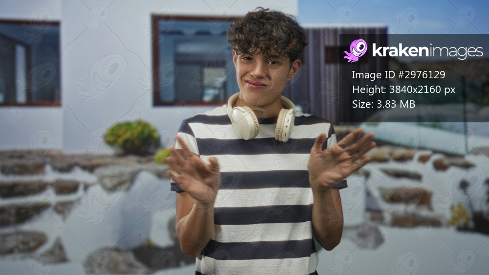 Teenage boy wearing headphones raises both hands palms out in front of studio backdrop showing a modern building facade; awkward playful shrug.