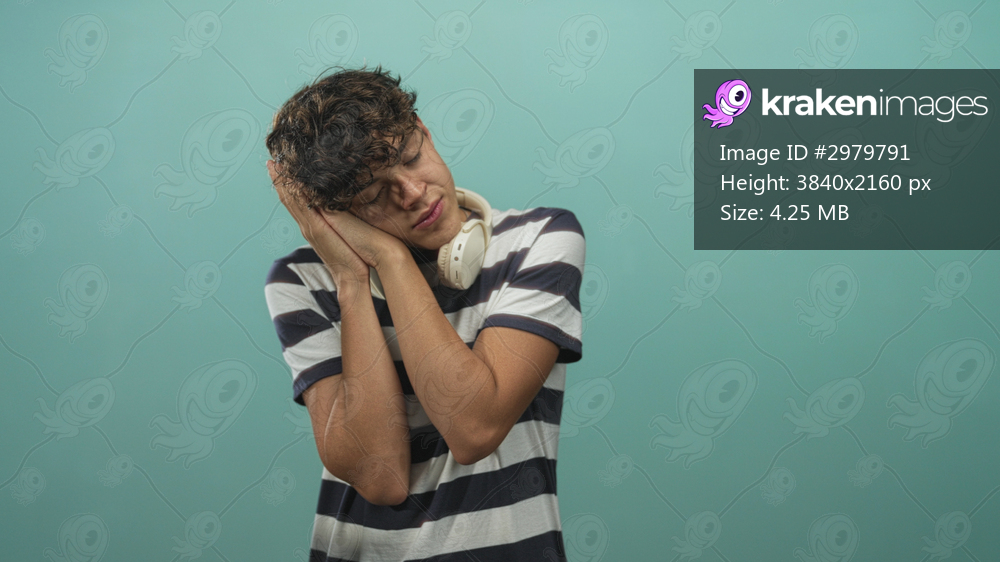 Teenage boy with white over ear headphones presses hands to cheek and tilts head with closed eyes in a studio against teal backdrop; serenity rest.