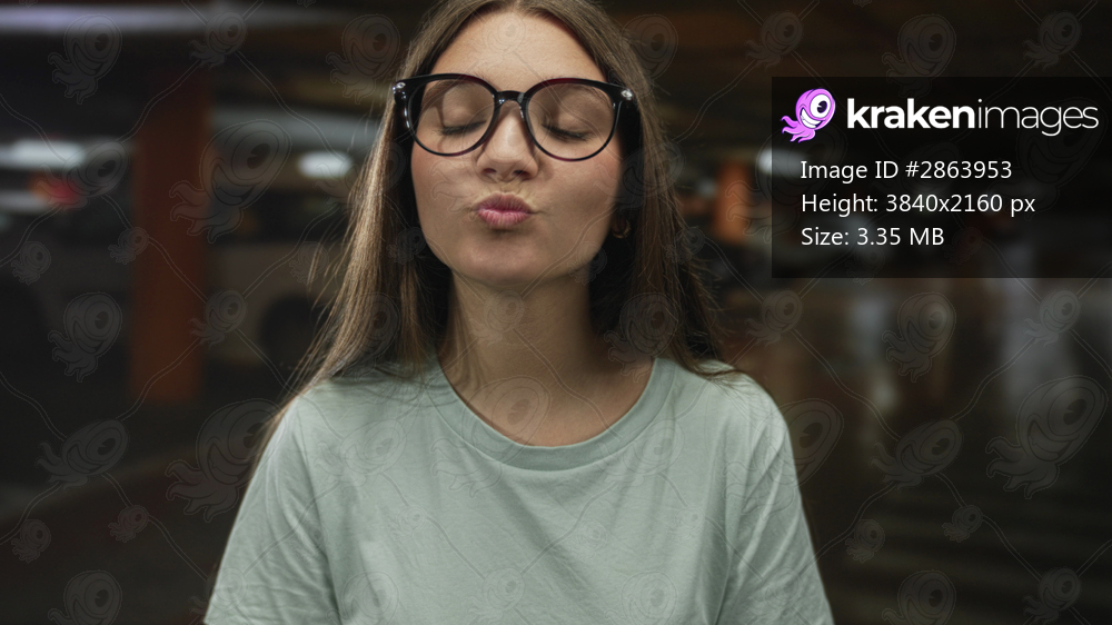 Teenage caucasian girl wearing black glasses puckers her lips in a dimly lit building; gentle affection.