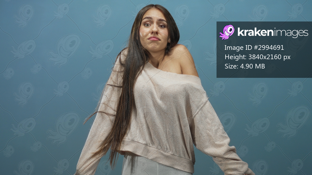 Teenage girl bare shoulder shrugging with braces visible and long hair, slight smile in a blue studio; youthful uncertainty.