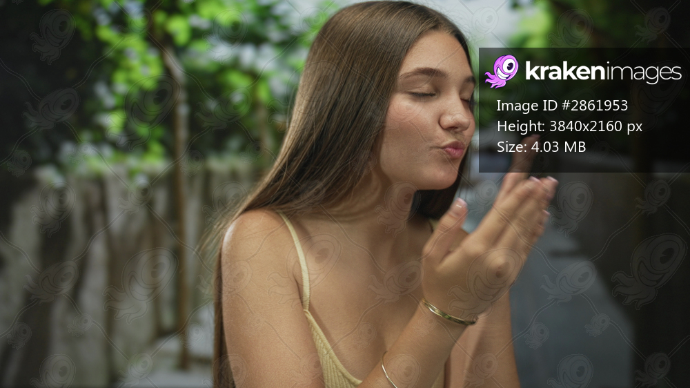 Teenage girl blows a kiss with puckered lips on sunlit street lined with trees in warm summer afternoon; affection.