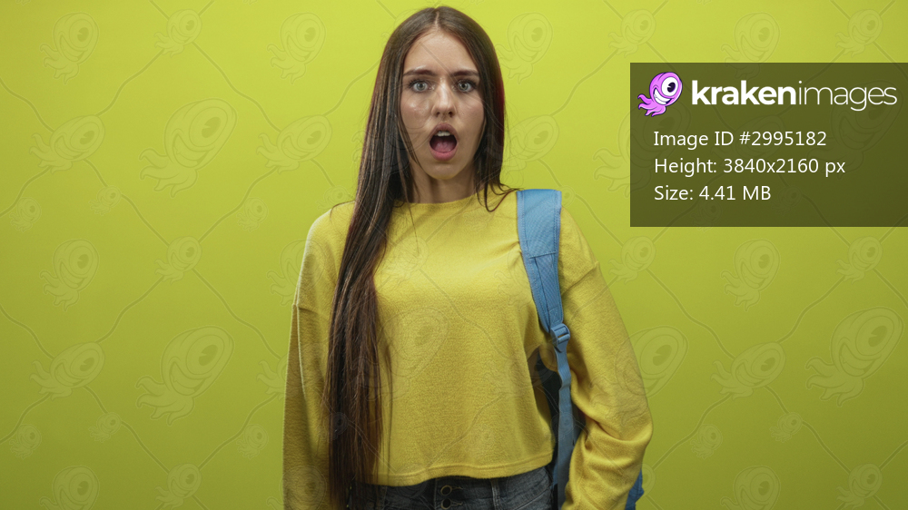 Teenage girl with blue backpack and mouth open in surprise in studio wearing yellow sweater; surprise curiosity.