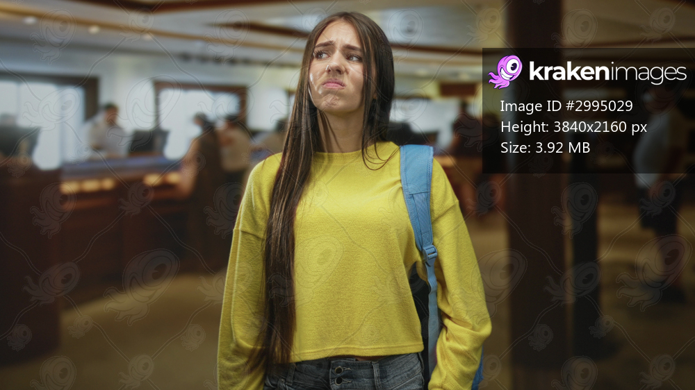 Teenage girl with blue backpack standing in a building reception area, pursed lips and hands at sides conveying impatience; frustration travel stress.