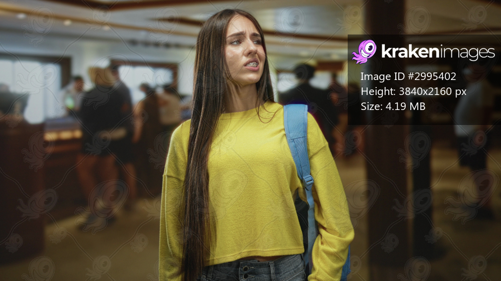 Teenage girl with blue backpack standing in a building reception area, pursed lips and hands at sides conveying impatience; frustration travel stress.
