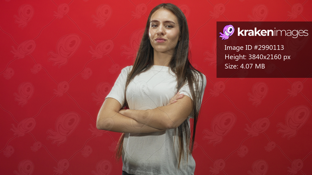 Teenage girl with braces crossing arms and smiling in a red studio, long hair and white t shirt visible, facing forward with confident stance; confidence youth empowerment. - Kraken Images