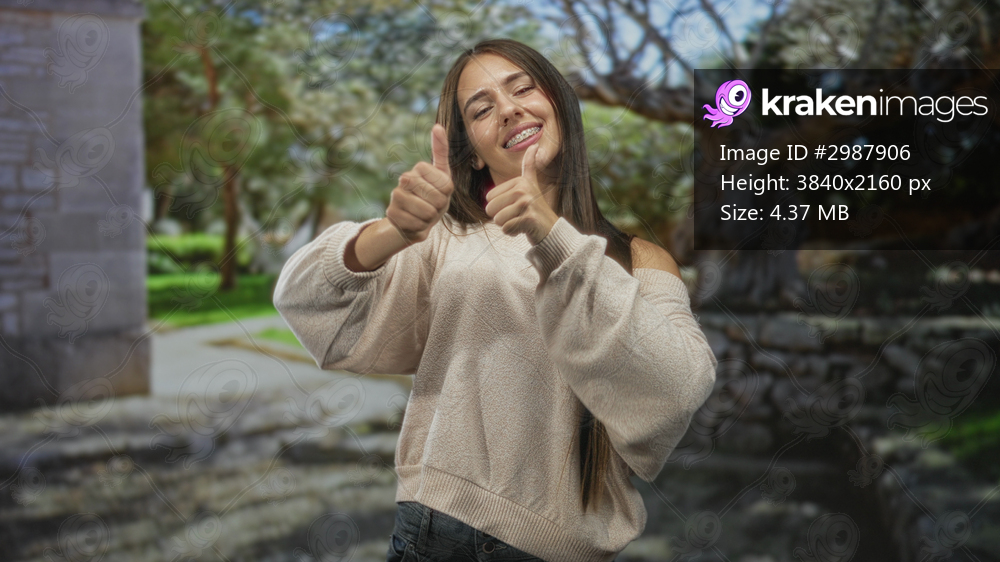 Teenage girl with braces giving double thumbs up, shoulder exposed sweater and long hair, smiling in front of stone building and leafy park path; youthful joy. - Kraken Images