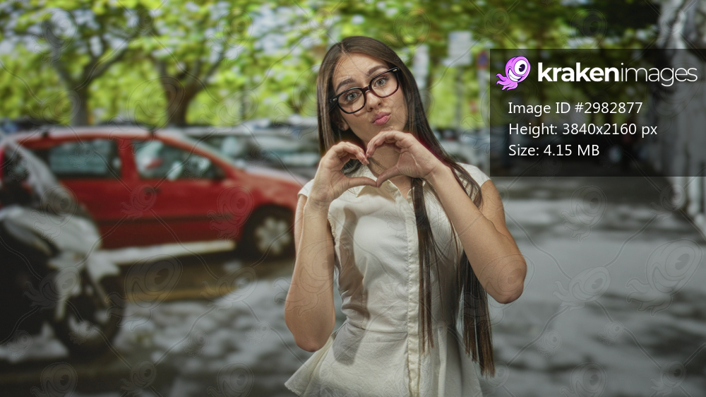 Teenage girl with braces and glasses forms a heart with hands while smiling on a street with parked cars; affection joy warmth.
