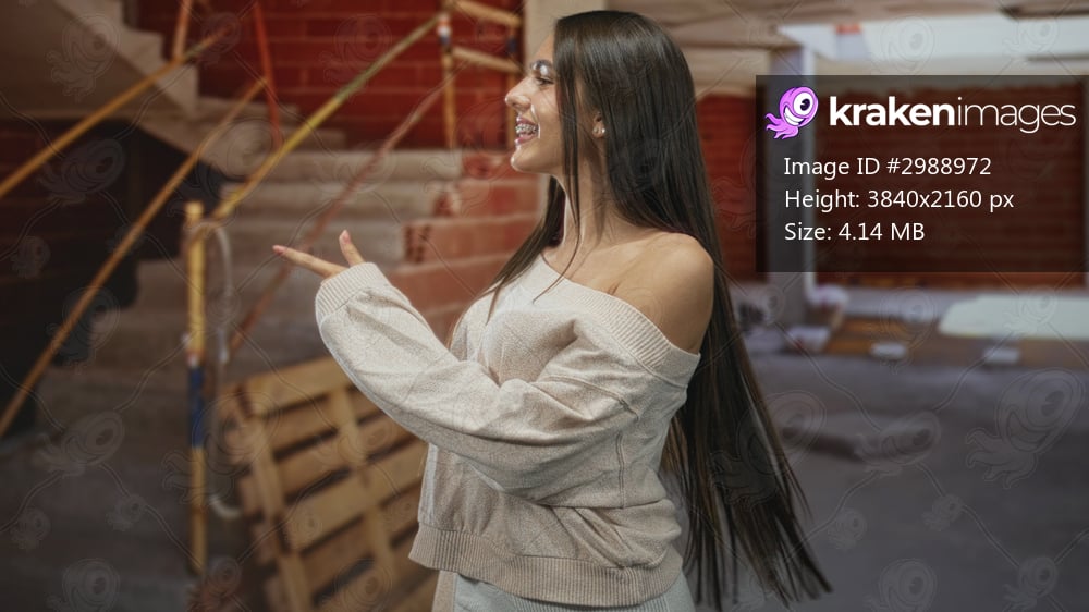Teenage girl with braces points finger and smiles, wearing a beige off shoulder sweater in an unfinished building with pallet and staircase visible; playful confidence. - Kraken Images