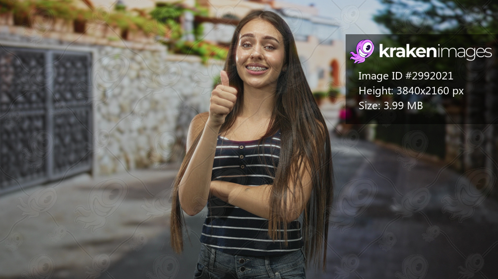 Teenage girl with braces smiles and gives thumbs up with arm crossed, wearing a striped tank top and jeans on a sunny street; confidence.