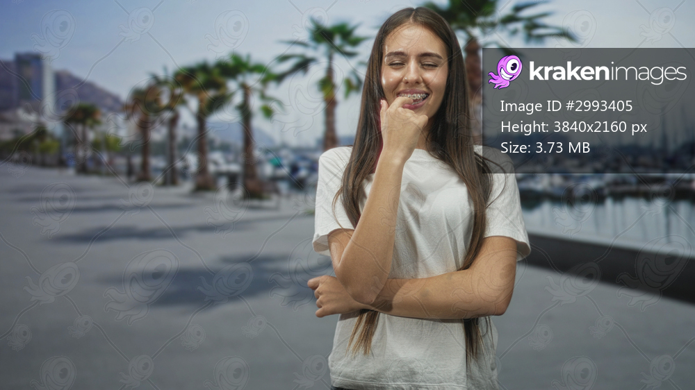 Teenage girl with braces smiling and touching her teeth with a finger on a seaside street lined with palm trees and boats; playful curiosity.