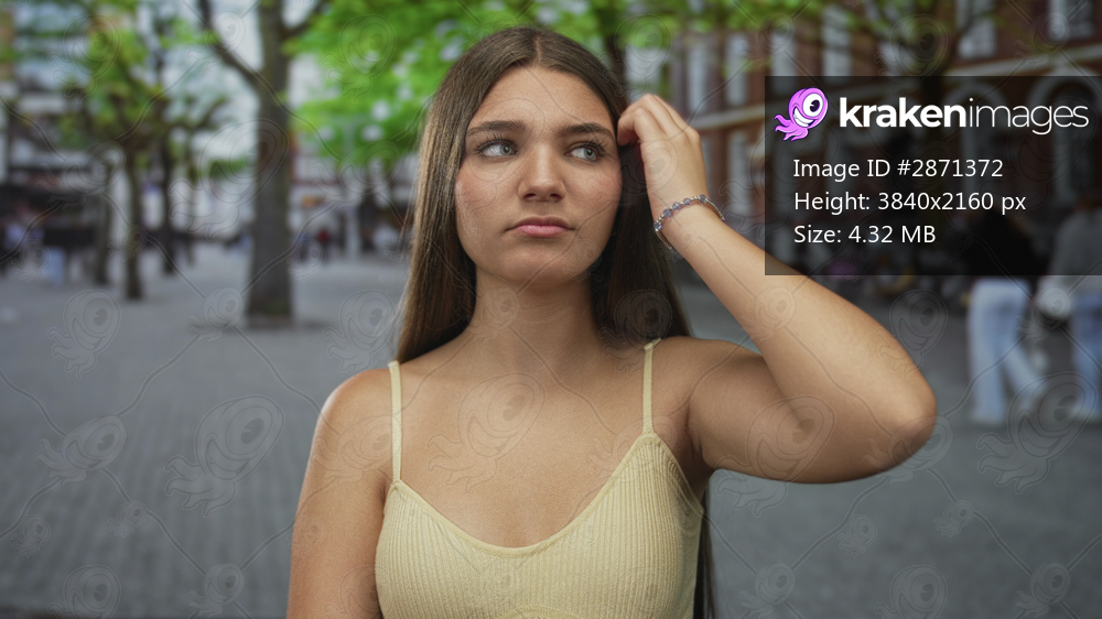 Teenage girl brushes hair with hand while looking sideways on urban street by a brick building; calm confidence introspection reflection.