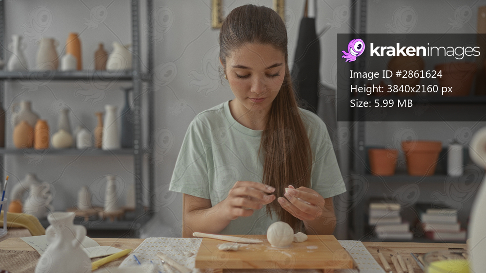 Teenage girl carefully sculpts clay ball with bare hands on wooden board in studio; creativity serenity.